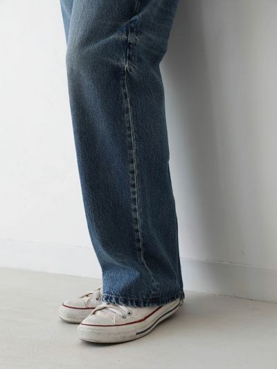定番の5ポケットのデザインで、脚のラインが出すぎないシンプルなストレートシルエットに。