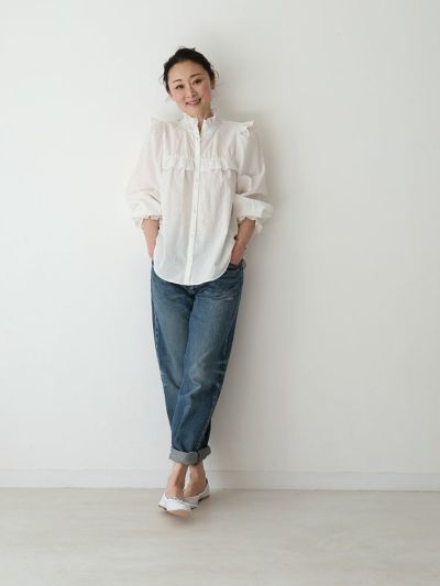 腰回りは深めに設定しているのでタックインもしやすく、スタイルアップ効果もありながら、メンズライクな雰囲気で着こなせる一着に仕上げました。