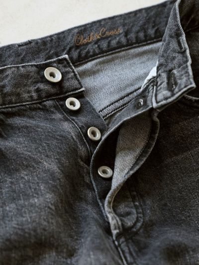 エイジング加工やさりげないクラッシュ加工でアクセントを付け、ウエストの内側にはチェーンステッチで"Cloth&Cross"の刺繍を施しました。