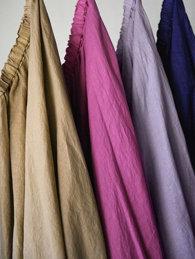 オリジナルカラーで染めたリネン100%の生地は、フィム加工で繊維を柔らかく揉みほぐしたストレスフリーな穿き心地。