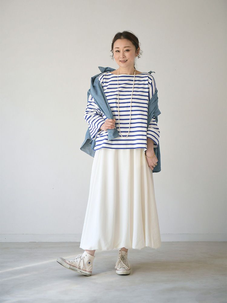 Tシャツとのカジュアルな着こなしはもちろん、ジャケットにブラウスをあわせればオケージョンシーンでも活躍します。