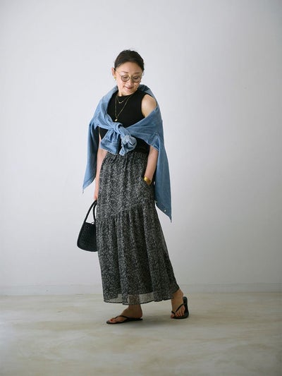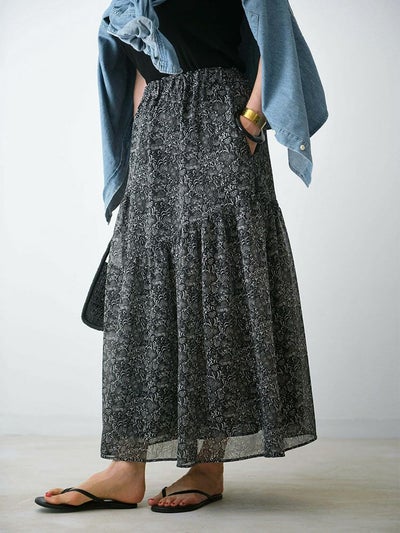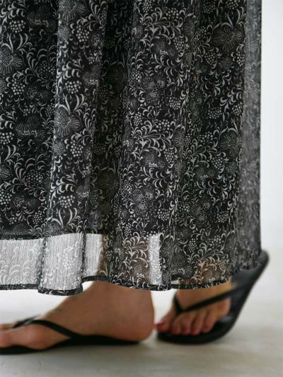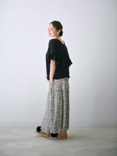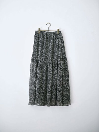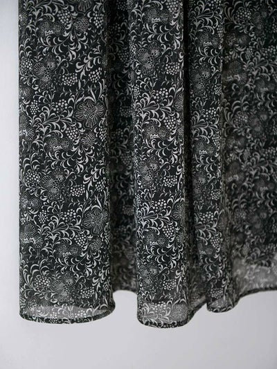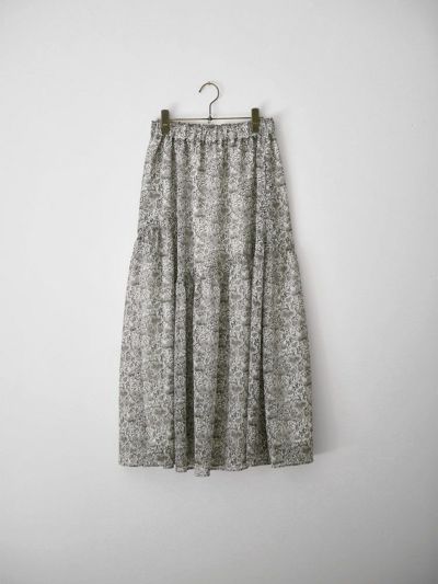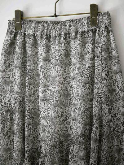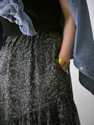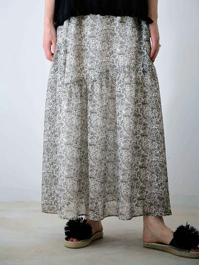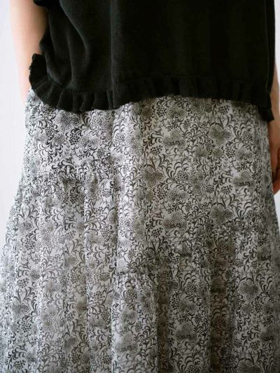 更紗風の繊細なタッチで描かれた、オリジナルのボタニカルプリントが目を惹くアシンメトリースカート。