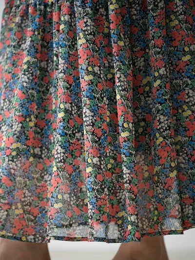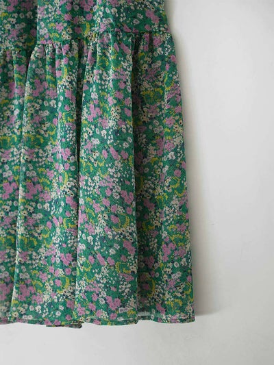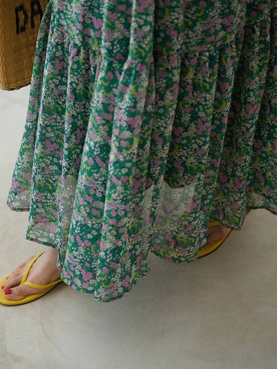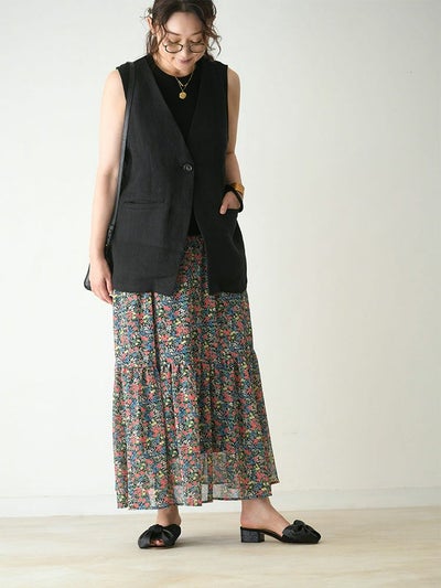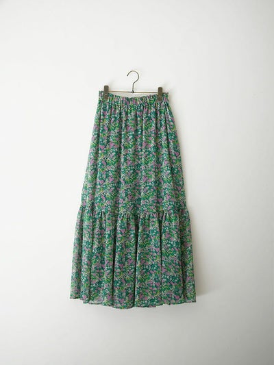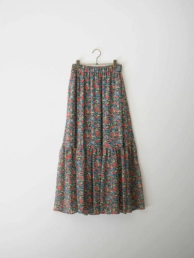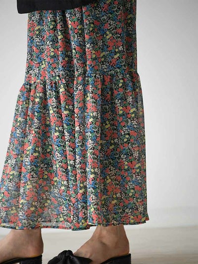 全面を多彩な花々で埋め尽くした、カラフルな色使いのティアードスカート。