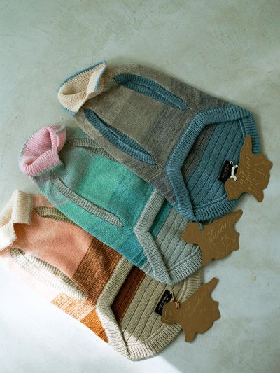 ワンちゃんの首回りサイズにも合わせやすいスリット入りのネック部分は、折り返してもサマになるよう先端を配色づかいに。