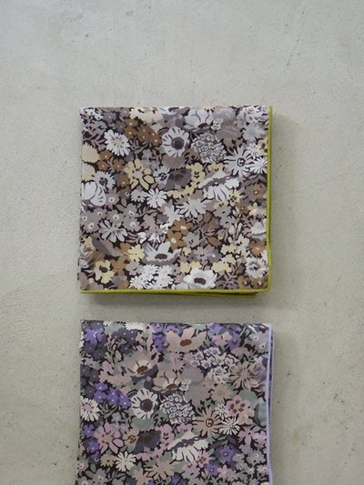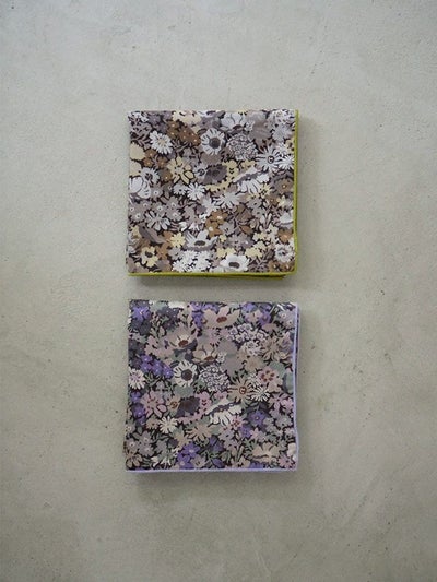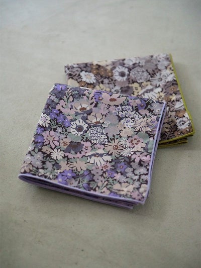 さまざまな花が緻密に描かれたリバティプリント「ソープ」のタナローンハンカチ。