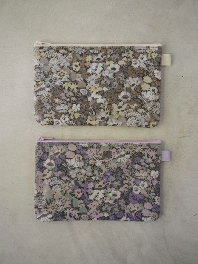 多彩な花々が緻密に描かれた、リバティ社の可憐なフラワープリント「ソープ」のフラットポーチ。