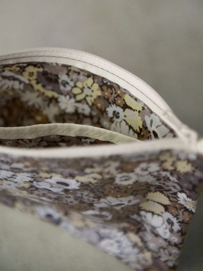 多彩な花々が緻密に描かれた、リバティ社の可憐なフラワープリント「ソープ」のフラットポーチ。