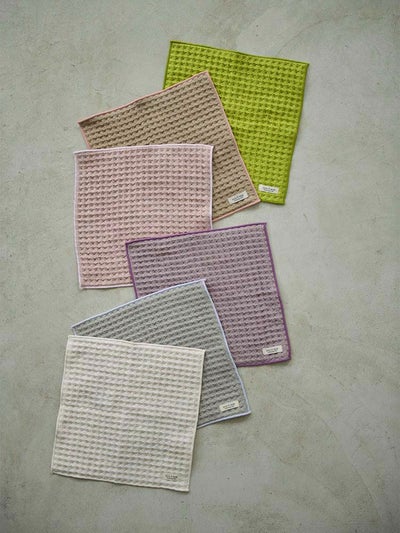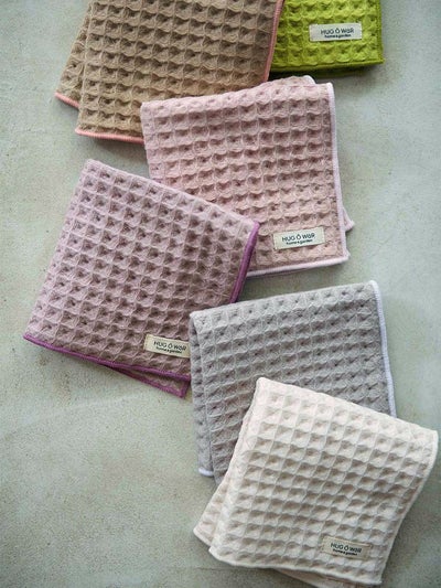 まるで焼き菓子のような格子状のワッフル織りに、縁かがりのカラーで遊び心をプラスしたハンドタオル。
