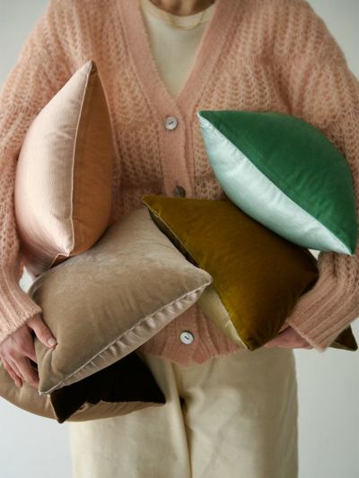 エレガントな光沢と深みある表情を両立させた、異素材使いのミニサイズクッション。
