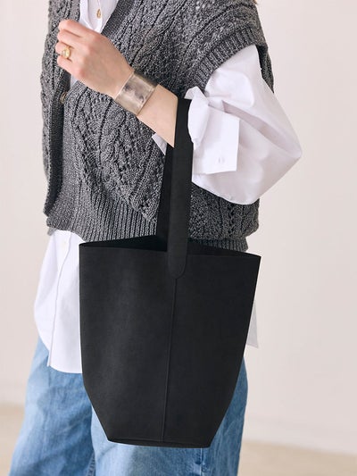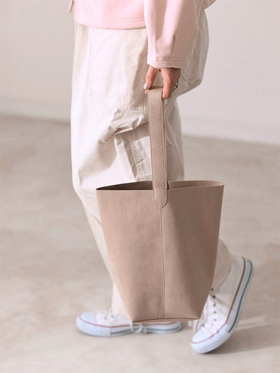 タイムレスに愛されるバケツ型のトートバッグを、なめらかな質感のウルトラスエードで。