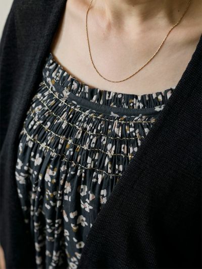 胸元にたっぷりと寄せたギャザーには、ゴールドのハンドステッチをあしらって、リュクスな雰囲気をプラス。