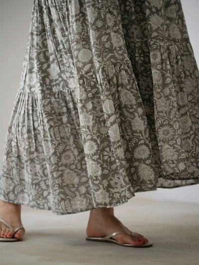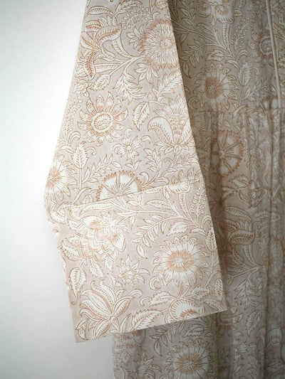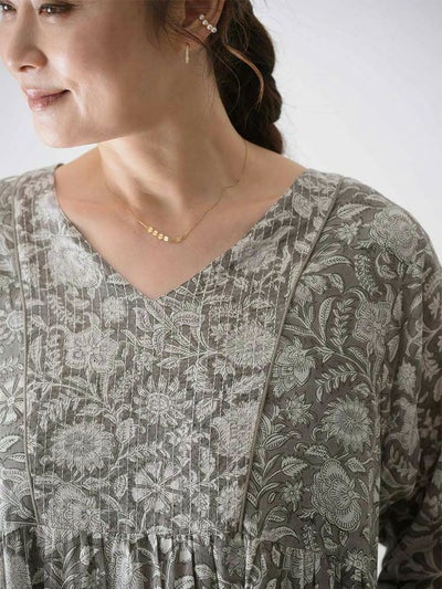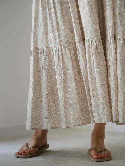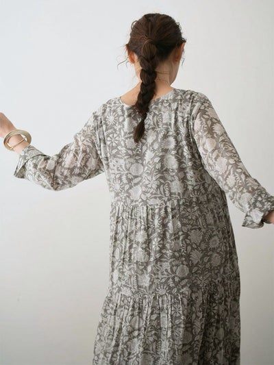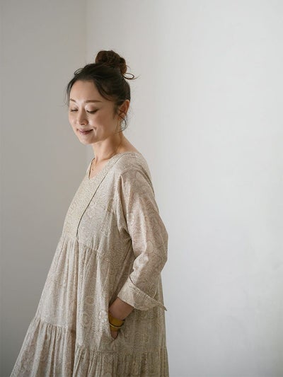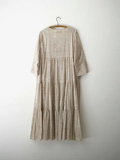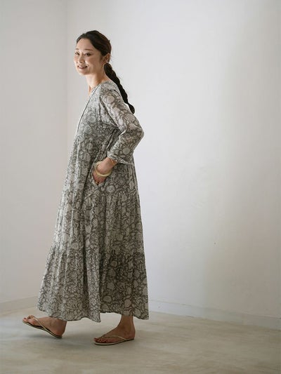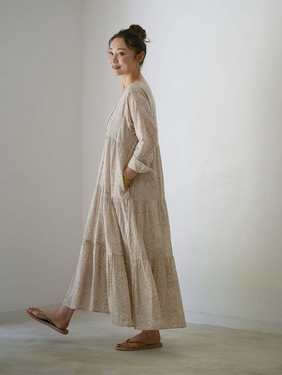 インドならではの柔らかなコットンボイル生地に、カラムカリ風のブロックプリントを施したティアードドレス。