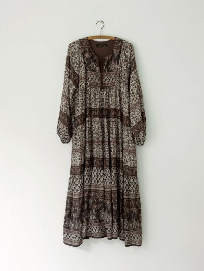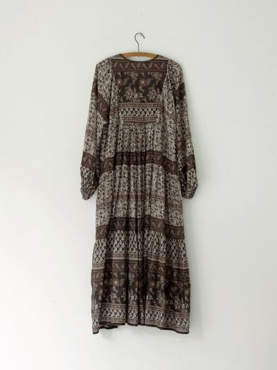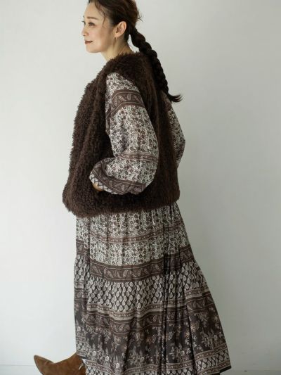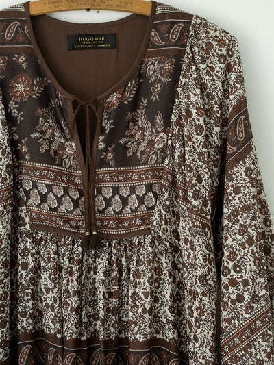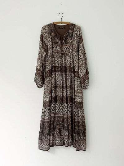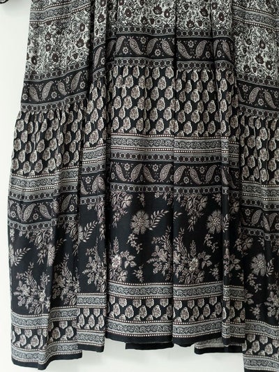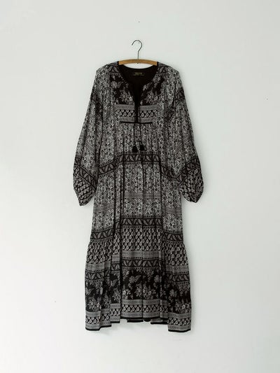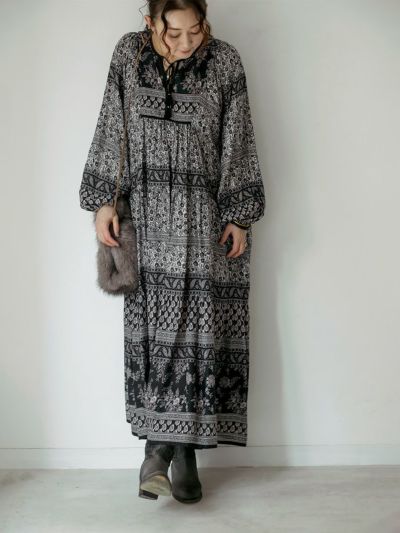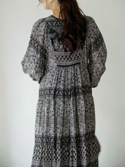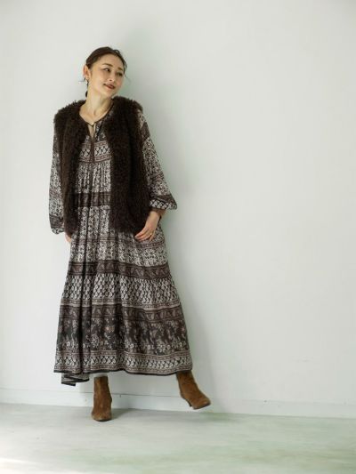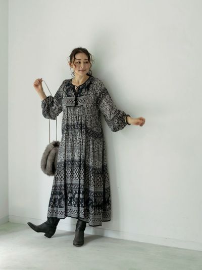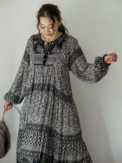 トレンド再燃中!一枚で華やぐボーホーシックなボヘミアンプリントのロング丈ティアードワンピース。