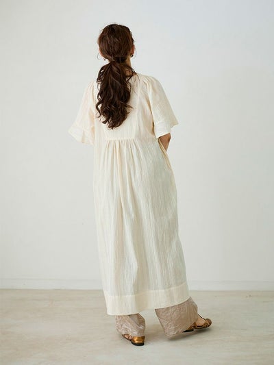きらめくラメ糸がリュクスな着こなしを演出する、軽やかなコットン素材のカフタンワンピース。