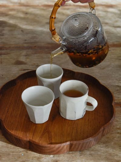 大麦やはと麦をベースに焙じ麦、熊笹、柿の葉、霊芝、はぶ茶、とうきび、プ―アール、玄米、どくだみ、豆茶、クコの実、ひき割りはと麦、黒豆、ゴ―ヤ、ウーロン茶、オオバコ、あまちゃづる、くわ茶、 タンポポ茶、浜茶、京番茶など23種類の野草やお茶、豆や実などをバランスよくブレンドした、こうばしい香りとまろやかな味わいが特徴の健康茶です。