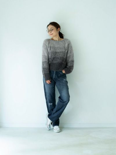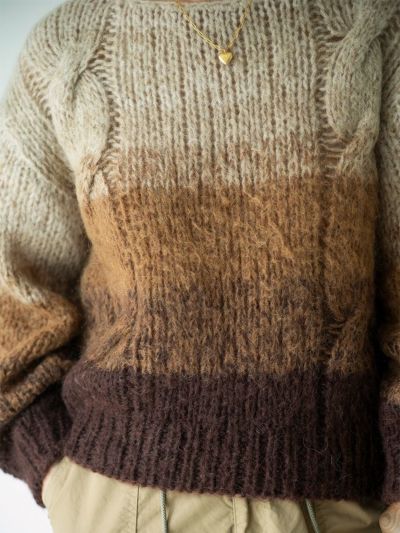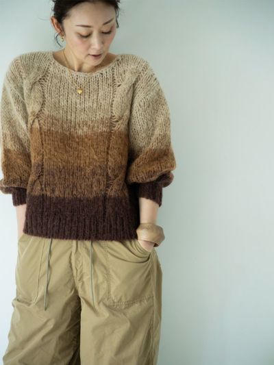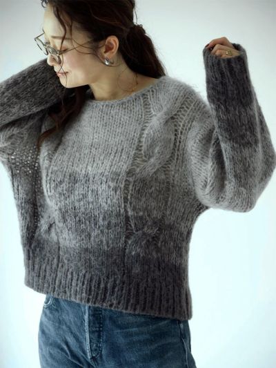 前身頃に施した大胆なケーブル編みと、ワンカラーの奥行きのあるグラデーションが印象的な一枚です。
