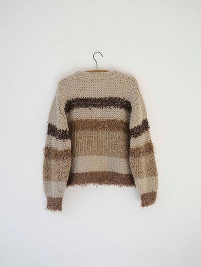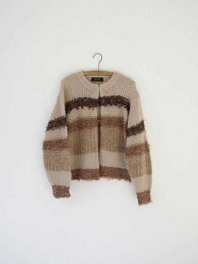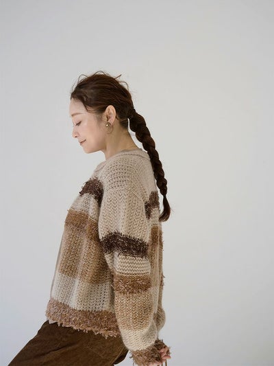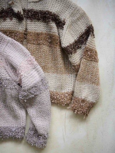 色のトーンで変化をつけた同系色のボーダー柄には、不織布のフリンジやラメ糸を編み込んで、立体感と上品な輝きをプラス。