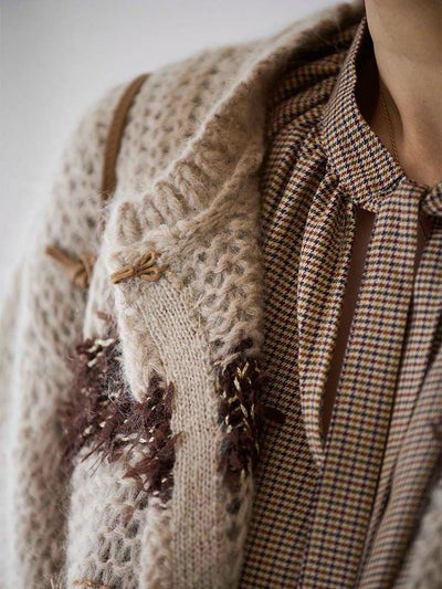 クラフト感ある手編みの襟元や、肌に馴染む優しいカラーと遊び心ある素材づかい。