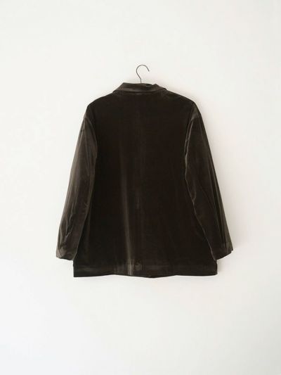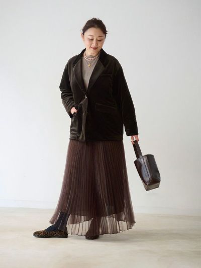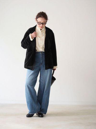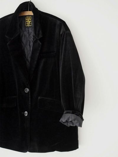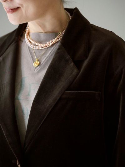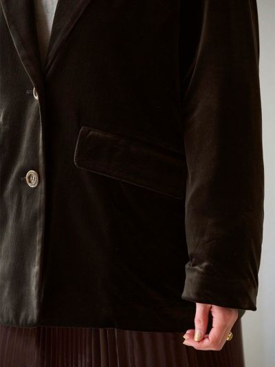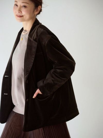 袖通しがよく、ベロアの本来のやわらかな落ち感を損なわないよう、細部までこだわった、仕立てのよさが光るアウターです。