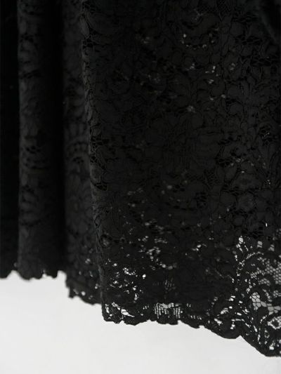 バックネックにはアンティーク調の小ぶりなボタンをあしらって、レースのスカラップを活かしたキャンディースリーブと裾で華やかな一枚に。