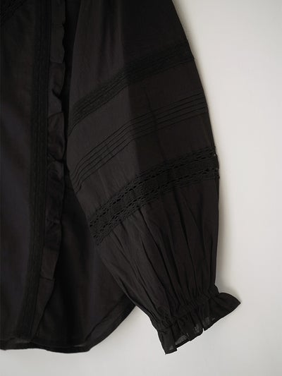 シャーリングをほどこしたフリルのスタンドカラーと、2種類のレースをあしらった袖、ふんわりと立体感のあるシルエットが、クラシカルなムードをいっそう引き立てます。