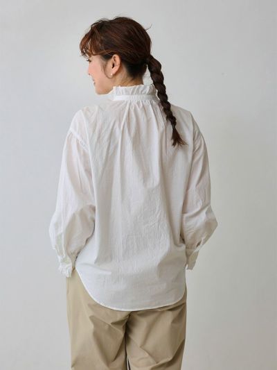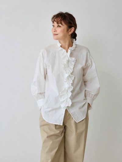 フロントのカットオフフリルが目を引くノンシャランなブラウスは、カジュアルな中にも上品さが漂う一枚です。