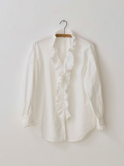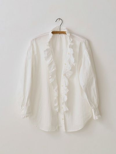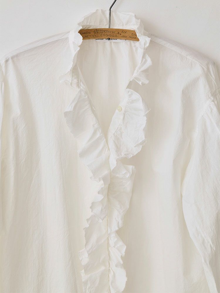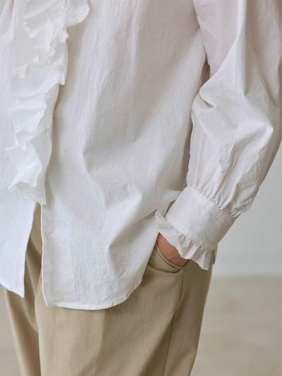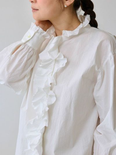 首元と袖口カフスに施した華奢なフリルと大胆な前立てのフリルが印象的。
