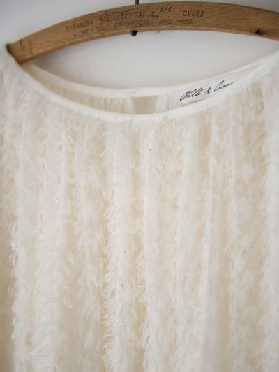 ふっくらとしたバルーンスリーブには立体的なタックを加え、パイピングを活かした背中のVカットで、さりげない抜け感を演出。