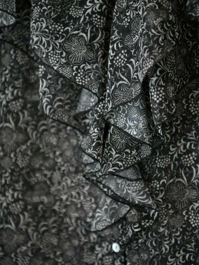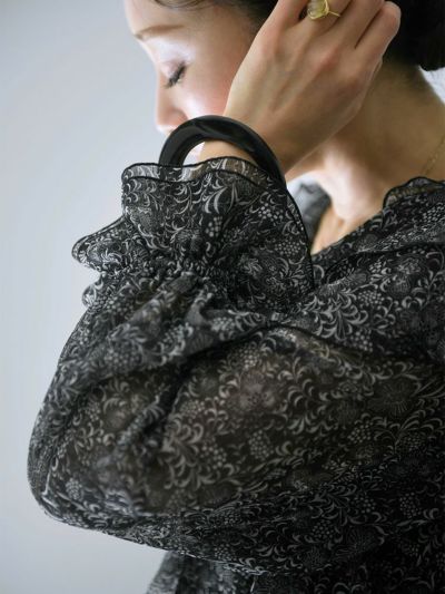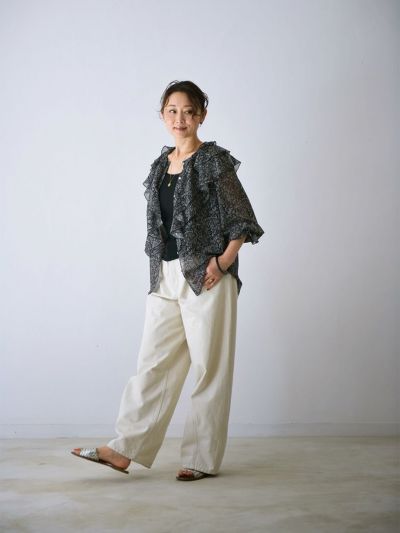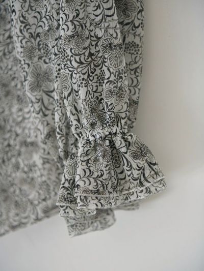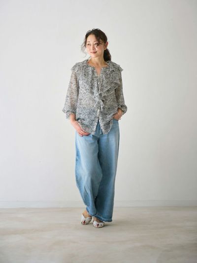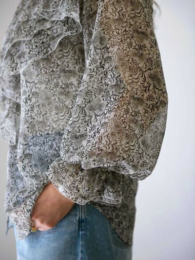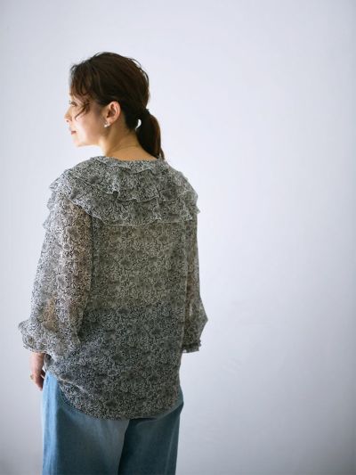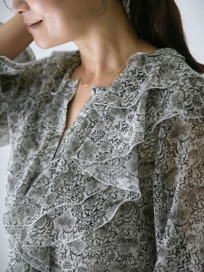 オリジナルで描き起こした更紗風のボタニカルプリントが目を惹く、エレガントなラッフルブラウス。