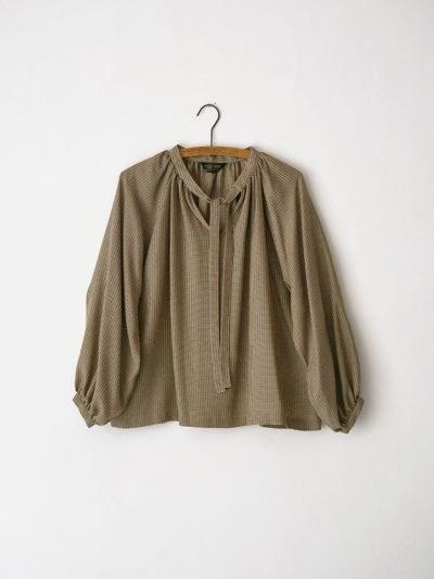 ネックラインのギャザーから生まれる、流れるようなドレープが美しいグレンチェックのチャーチブラウス。
