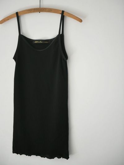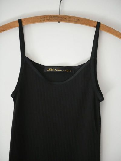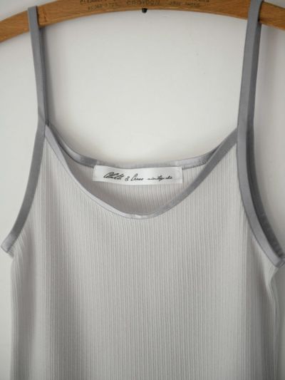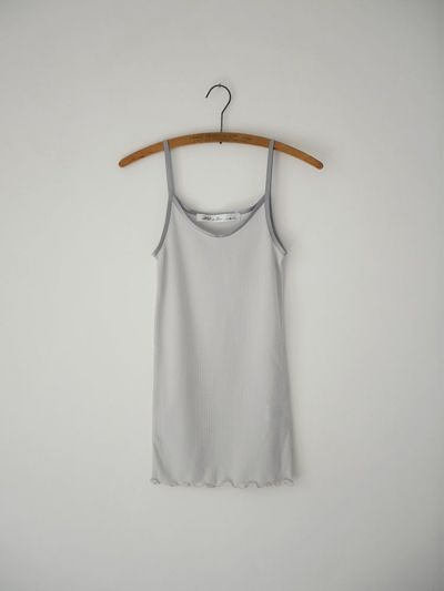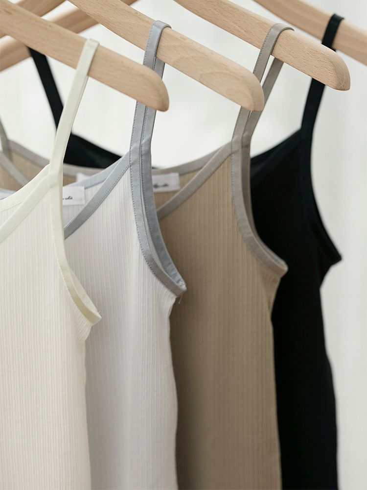 ストレッチ性の高い繊細なテレコ素材に、サテン生地のパイピングとショルダーストラップが都会的な一枚です。