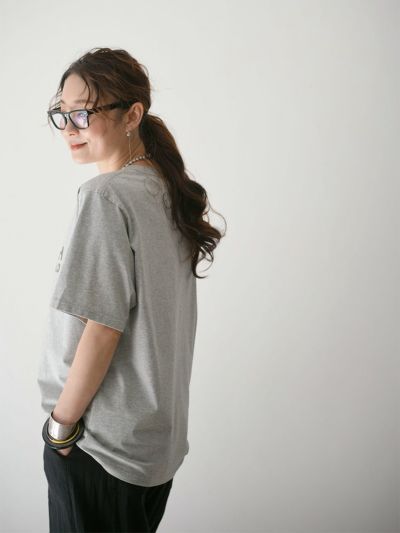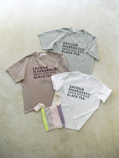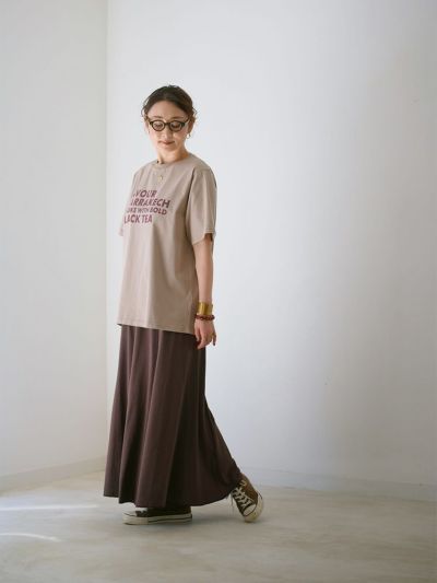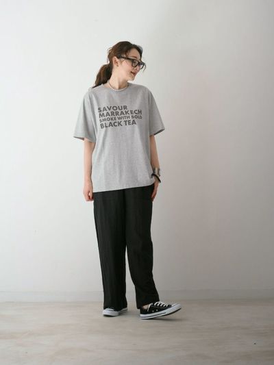 メンズライクなBOXシルエットに、都会的な文字をプリントしたTシャツ。