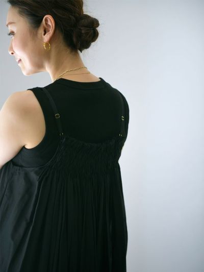 コンパクトなネックラインと深めのアームホールがトレンドライクで、シャツやキャミソールドレスをレイヤードすれば旬のスタイリングに。