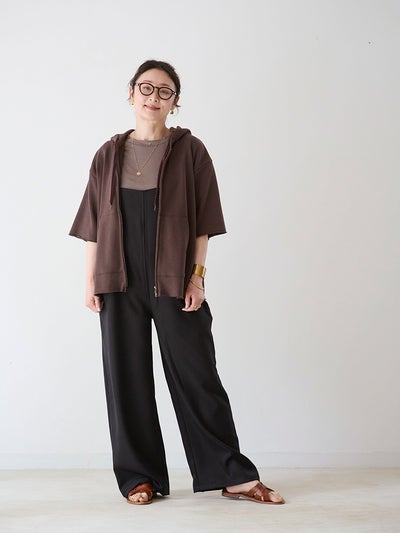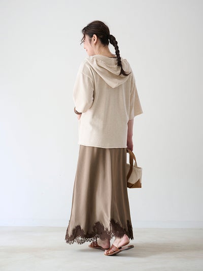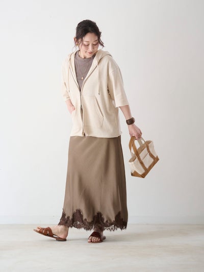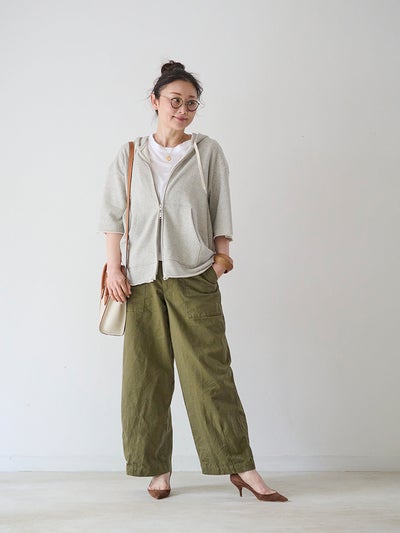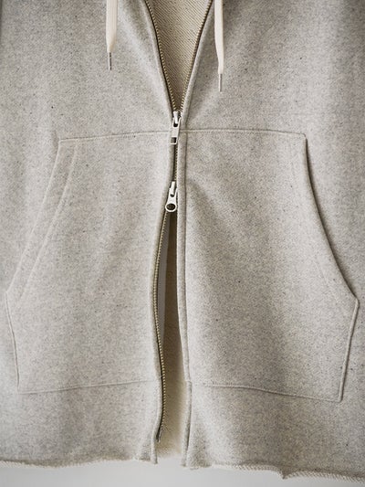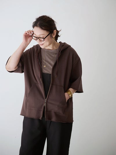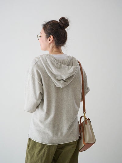 袖口や裾のカットオフ始末が、シンプルなパーカースタイルに程よい抜け感をプラス。