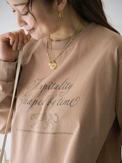 肌に馴染む質感とプリントのメッセージが溶け合うこの一枚に、小さなドット柄のバッグを添えてお届けします。