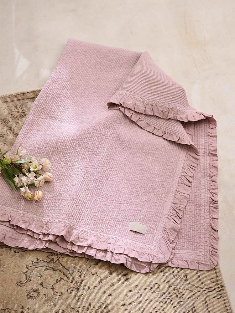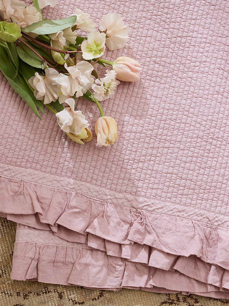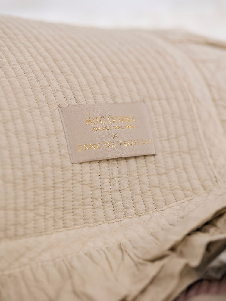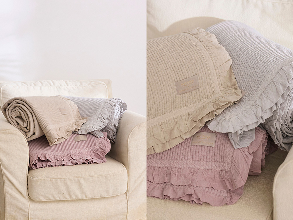 フレンチアンティークのファブリックをイメージして、四方にはたっぷりと大きめのフリルを。 洗いざらしのような質感と ピグメント染めによる色ムラで 使い込んだような独特の風合いを表現しました。 |